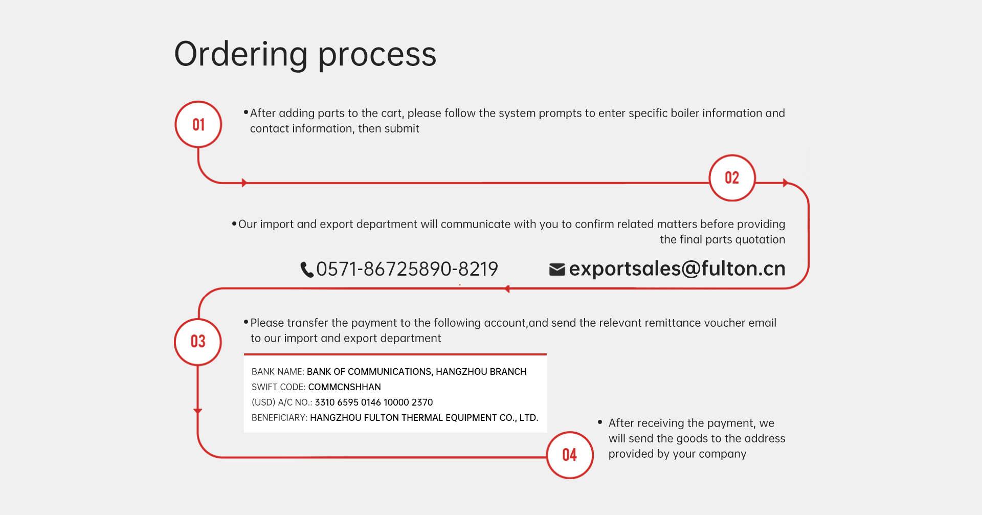 If you encounter any problems during the ordering process, please contact exportsales@fulton.cn. Attention: Kathy Chen